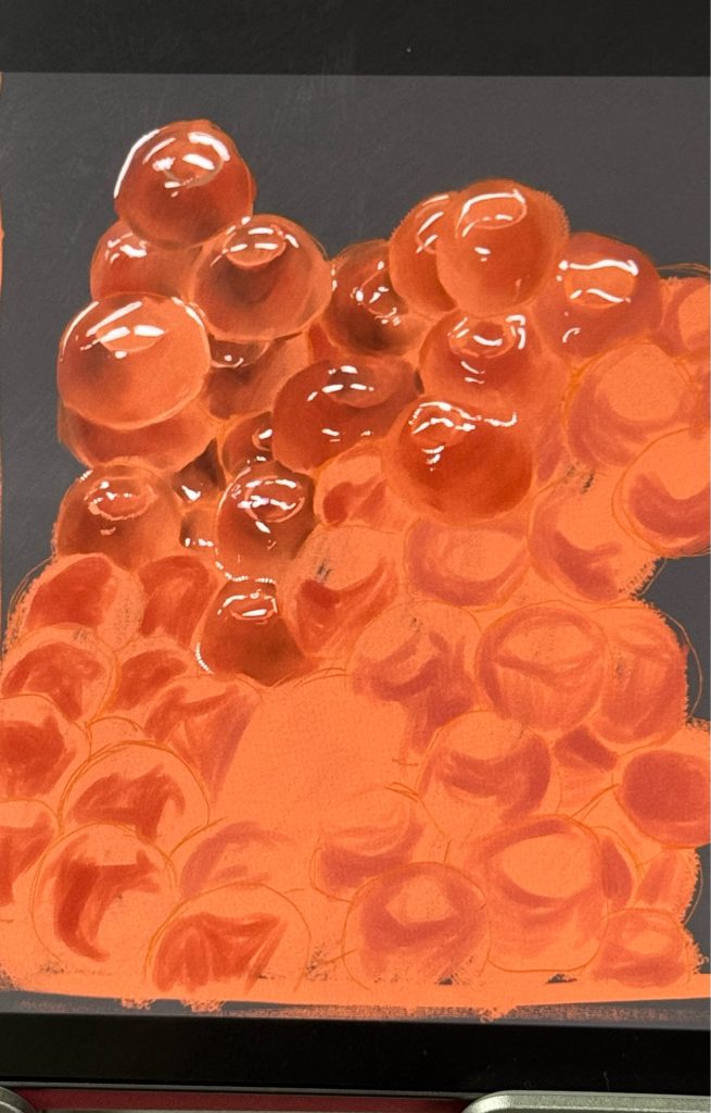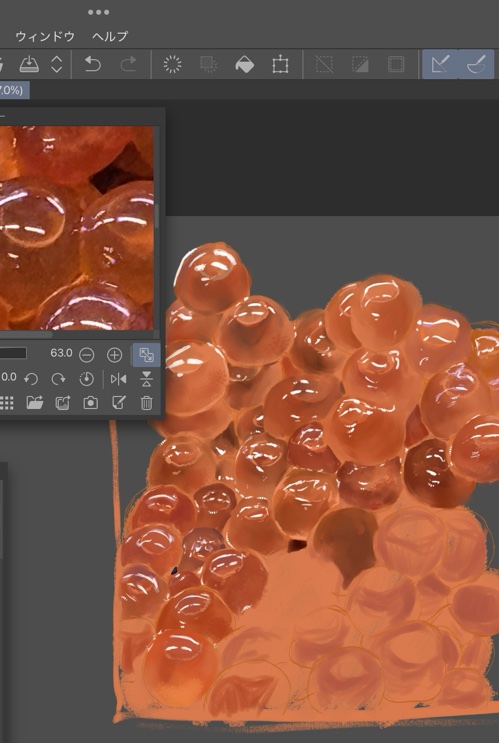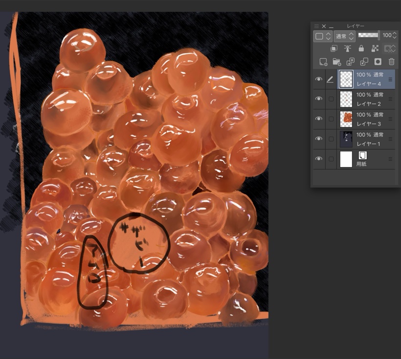 ハイライトは多分ハッキリさせた方がいいだろうとここだけレイヤーを別にする。よくイクラ本体レイヤーと間違えて塗り進めており、おかしなことになっている。なのでよく見るとハイライトしか描いてないはずのレイヤーにも赤いシミみたいな塗りがある。